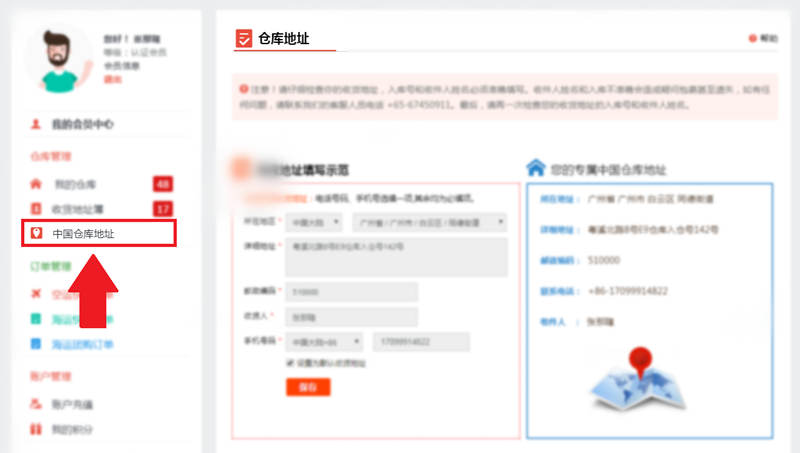获取会员专属的中国海运仓库地址操作演示: